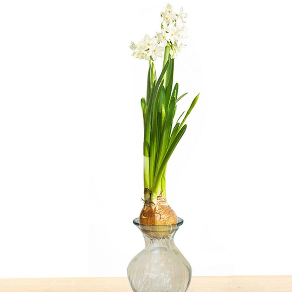 Forcing Paperwhites indoors on water is simple, easy, and fun. It just takes a little patience. We even supply a special glass. Anyone can do it. Included is 1 very large 19/plus cm Ziva Paperwhite bulb and a clear, sturdy, artisan glass especially designed for this purpose.