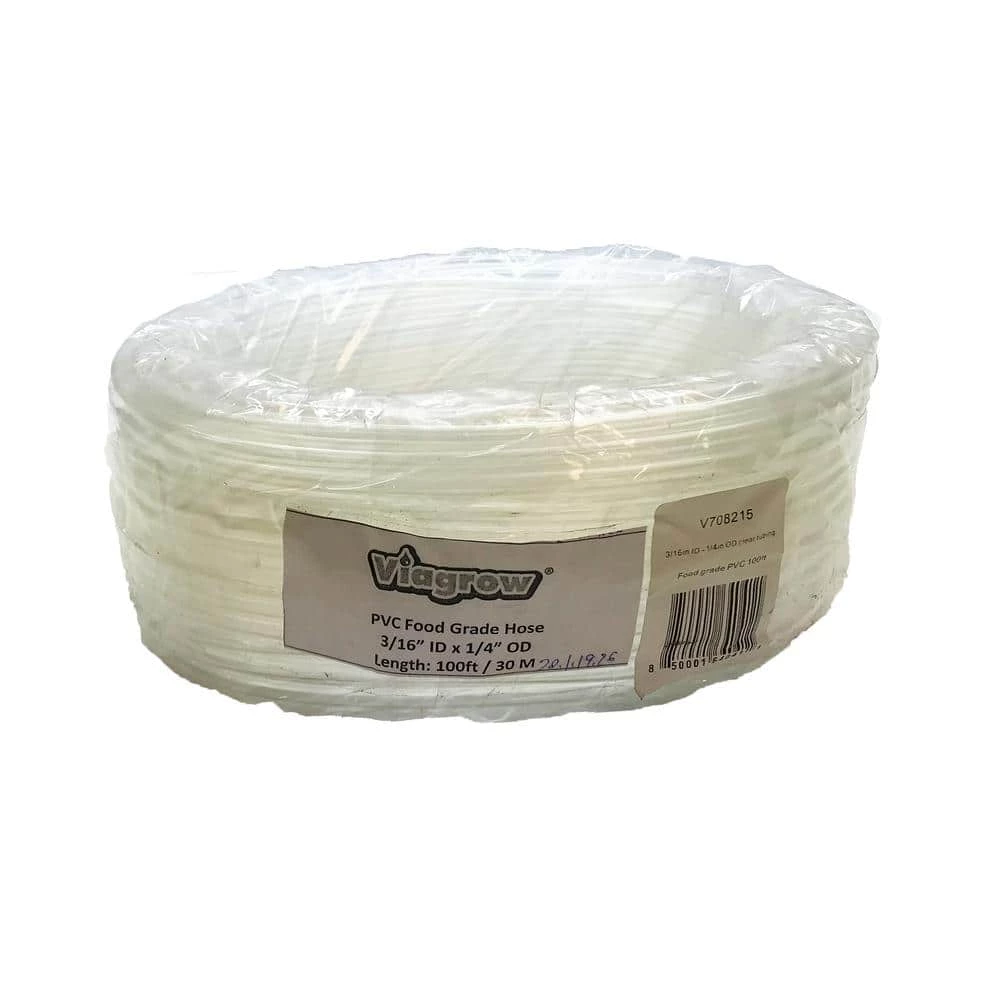Viagrow Food Grade Multipurpose air tubing can be used for irrigation lines, Beer Line, Kegerator, Wine Making, Airline Tubing for Aquarium application. Viagrow Food grade PVC hose can be used in hydroponics, aquaponics, DWC ( Deep Water Culture ) hydroponic kits and is great for grow rooms and green houses and our 1/2 in. and 3/4 in. tubing will accommodate most ebb and flow or flood and drain hydroponic kits. The Viagrow multipurpose food grade tubing is available in 100 ft. roles and the following sizes: Part number V708215: 3/16 in. ID – 1/4 in. OD clear tubing Working pressure psi 43.5 Working temp -5-65C/23-149F Part number V708265: 1/2 in. ID – 5/8 in. OD black food grade PVC tubing Working pressure psi 58, 43.5 Working temp -5-65C/23-149F Part number V708201: 1/2 in. ID-5/8 in. OD translucent blue tubing Working pressure psi 58, 43.5 Working temp -5-65C/23-149F Part number V708245: 3/4 in. ID – 1 in. OD, black food grade PVC tubing Working pressure psi 43.5, 43.5 Working temp -5°C to 65°C/23°F-149°F.