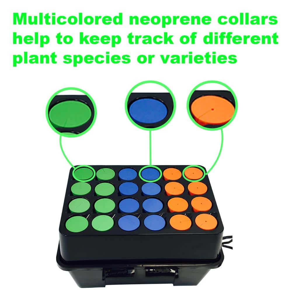 - Multicolored neoprene collars help to keep track of different plant species or varieties