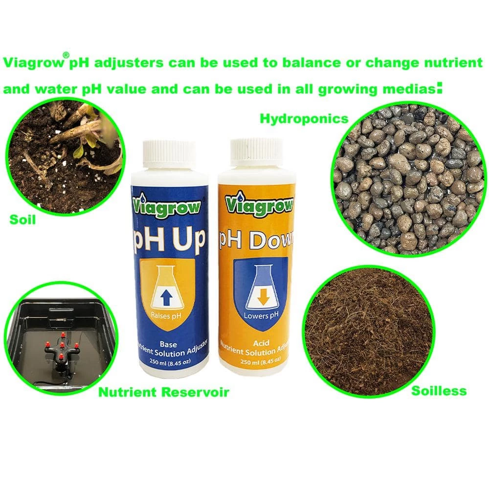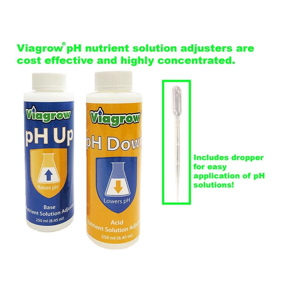 The Viagrow pH Test Kit comes complete with pH up & down liquid nutrient adjusting solution & is formulated using the highest food grade quality & includes a broad range pH Test Kit Which will indicate the pH value of your nutrient solution. While the liquid pH down solution uses food grade phosphoric acid & is safe for all food crops, the pH up uses food grade potassium hydroxide & is safe for all food crops. The Viagrow pH up & down are highly concentrated so less is needed for use as compared to most brands. Viagrow pH up & down can be used in all growing mediums – soil, soilless, hydroponics, or to adjust a foliar application. Maintaining a proper pH is an important part of growing healthy plants & Your broad range pH Test Kit will measure pH as low as 4 & as high as a value of 10 to grow the most vigorous plants maintain a slightly acidic pH in your choice of growing Media, It is recommended that the pH for most crops fall between 5.5 & 6.5 use moderately. Add 1 Drop of adjusting solution at a time to the plant nutrient solution & then test the pH. Repeat application & test again until appropriate pH level is achieved